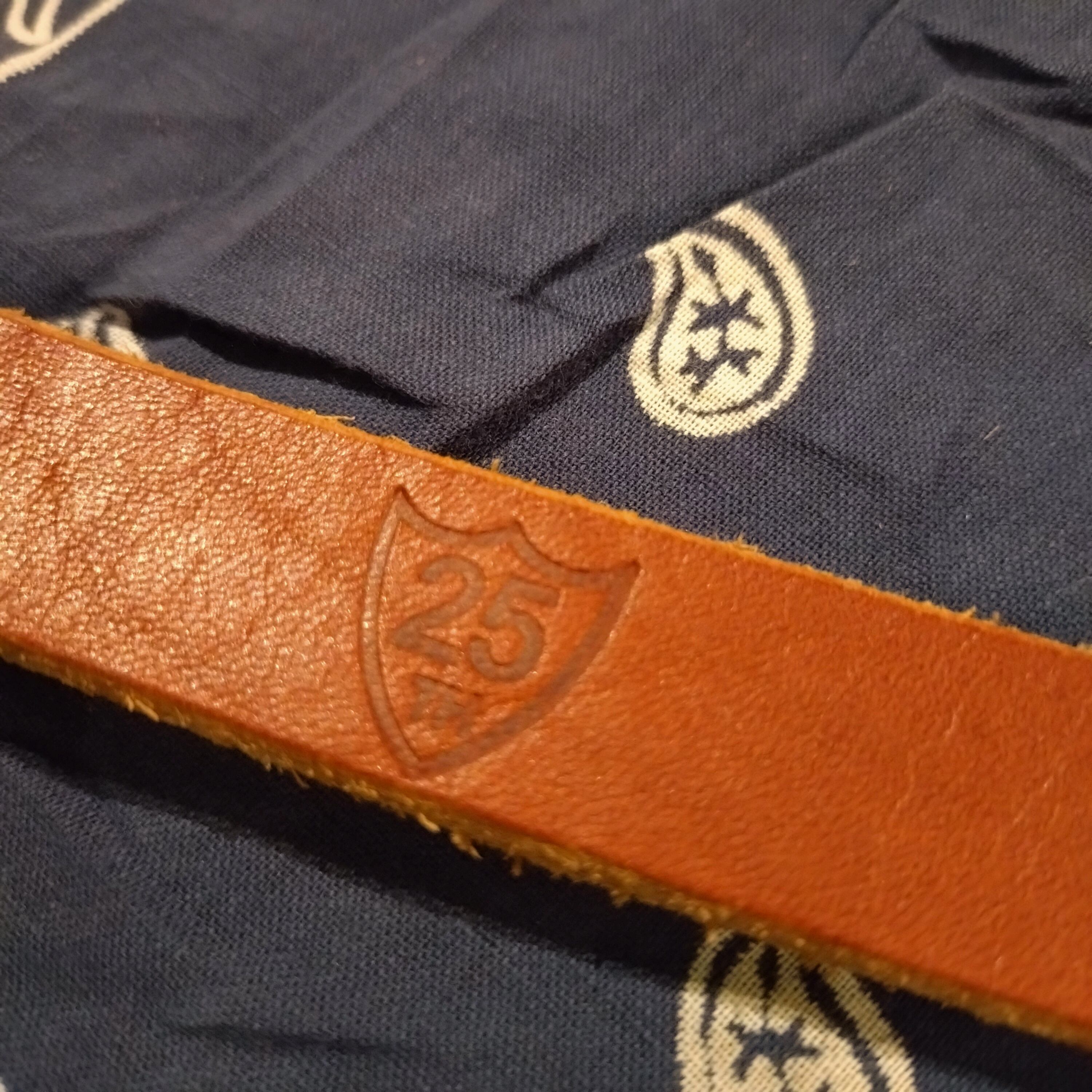 ベルト幅は0.75inch(約1.9cm)、バックル横には25周年記念の刻印を施しています。