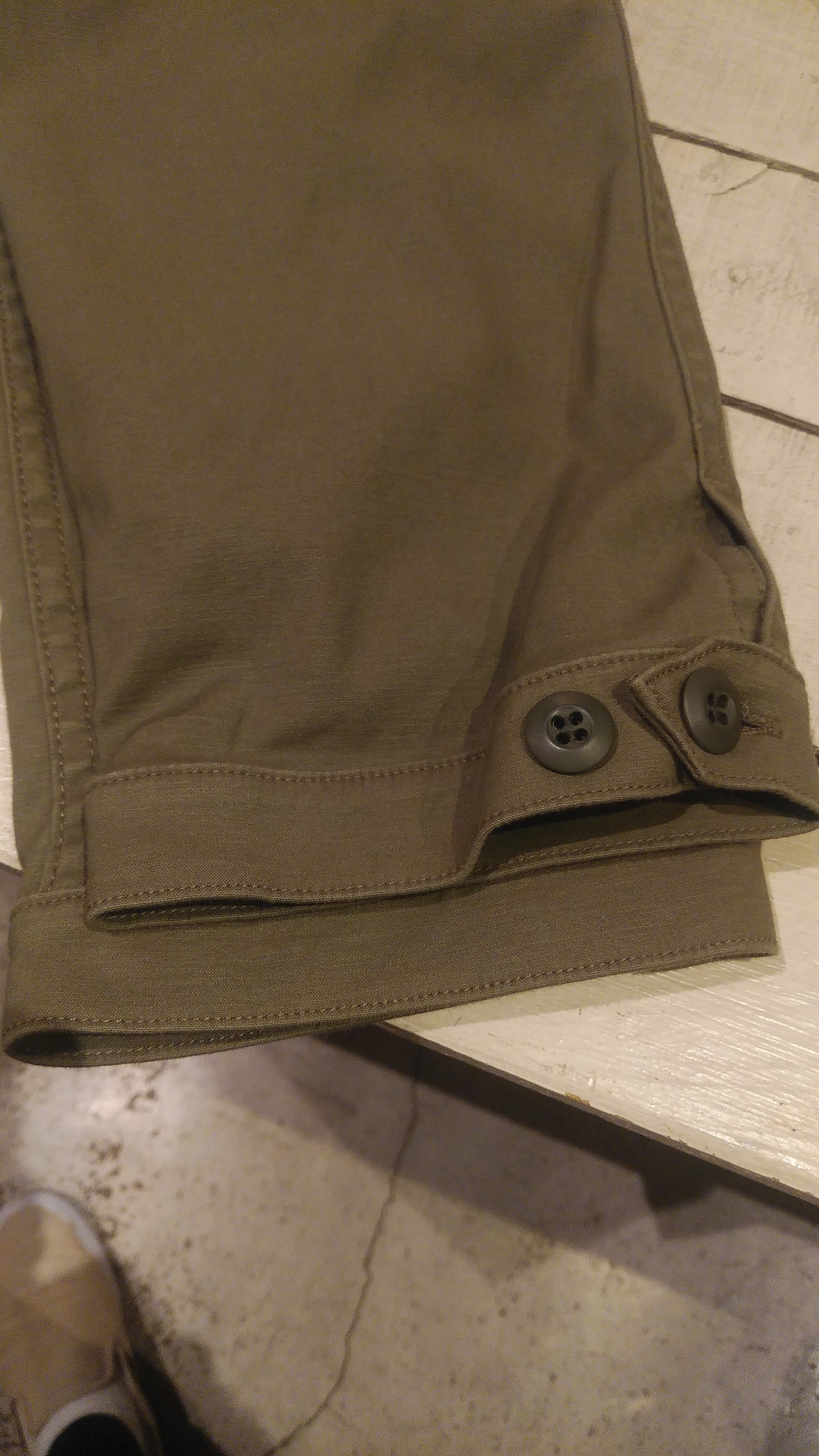 ストレッチ性の高いバックサテンを使用したスリムベイカーパンツです。ヴィンテージのミリタリーパンツをアレンジした細身のシルエットで上品な印象です。ウエストのアジャスターベルトでのウエスト調整や、裾のタブでシルエットの調整が出来るので、色々なコーディネートで合わせていただける汎用性の高さも魅力です。