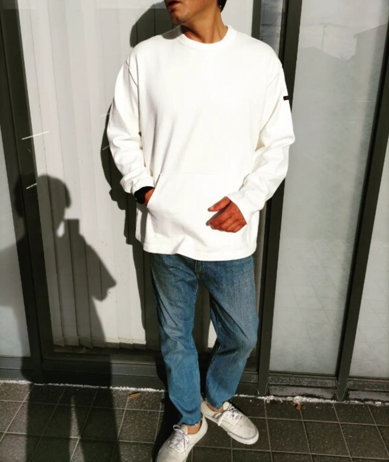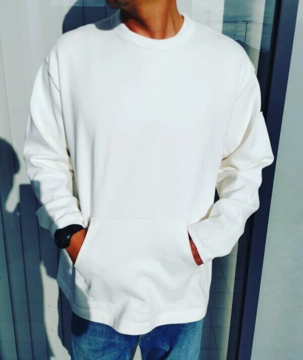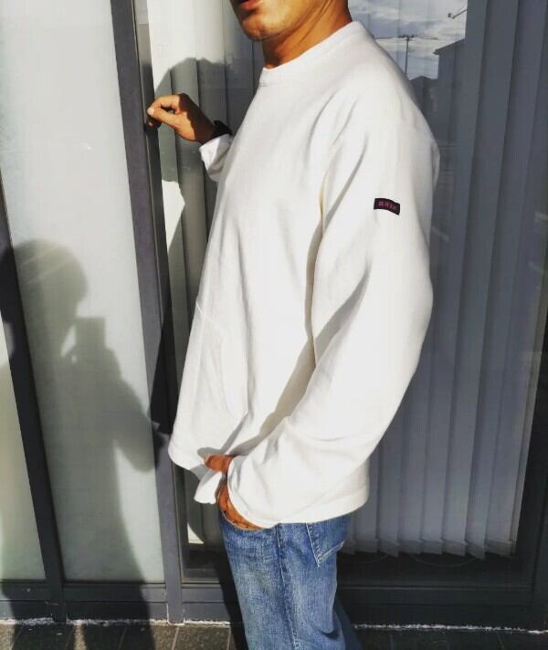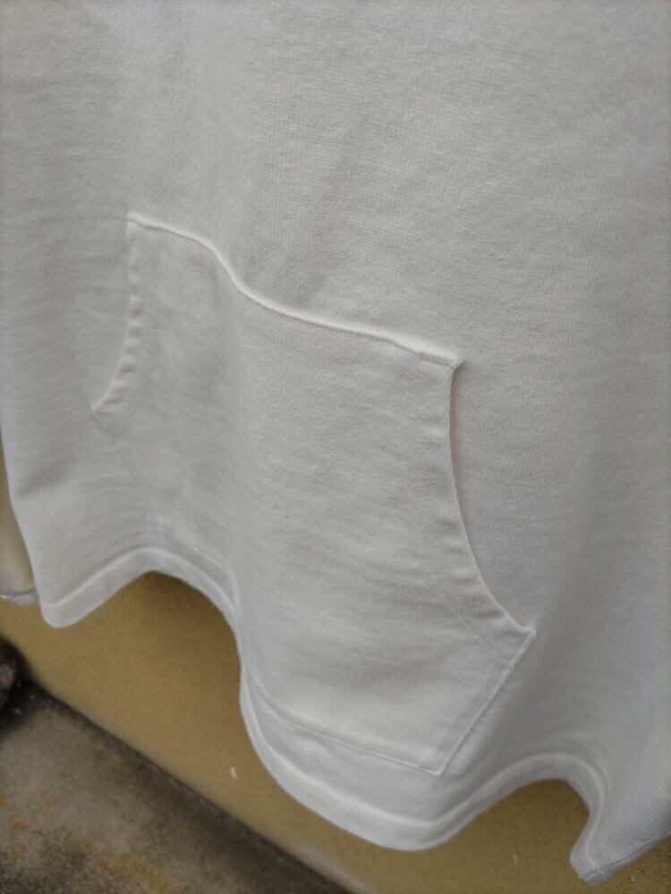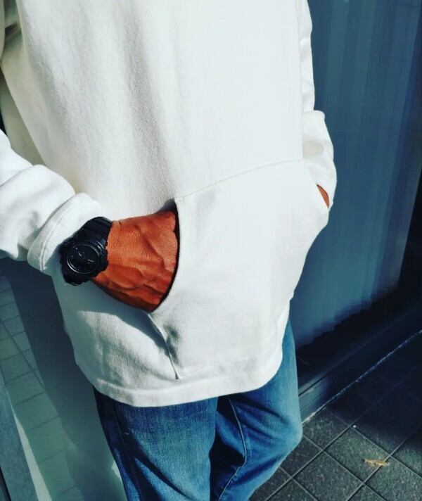 古いラグビーシャツのような、重厚感のあるコットン天竺生地を使っています。一般的なロングスリーブTシャツでは珍しいカンガルーポケットがデザインと実用面を兼ね備えています。タフな生地に付いたポケットは伸びることも少なく、機能的に使用することができます。また洗濯にも強く、斜行がしにくい丈夫な生地なので長く着用いただけます。