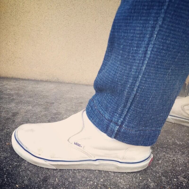 一般的に柄を織るジャカード織機は通常の織機で織ることのできない組織を織ることができます。経糸のインディゴか流れるように生地の表面に複雑に現れる不思議な表情です。肉感があってふわっと柔らかな独特の生地感をベーシックなトラウザーズにすることで生地の良さが際立つ一本です。同素材のワークジャケットとのセットアップもおすすめです。